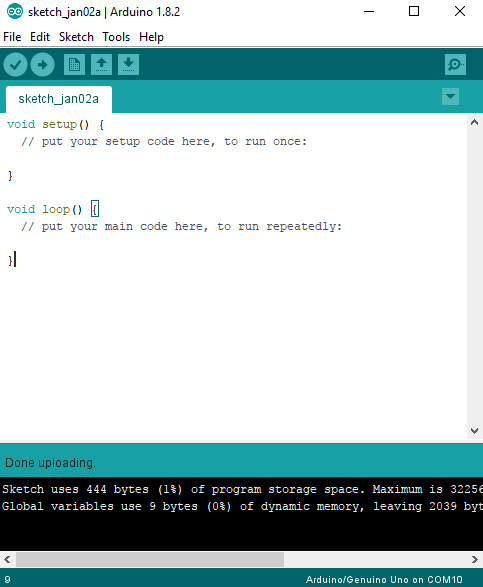 jika sudah benar menghubungkan  Arduino Uno dengan ESP8266 selanjutnya kita akan menguplode program kosong pada Arduino Uno