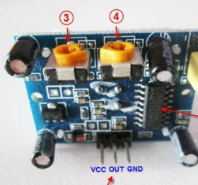 potensio yang ditunjukan nomer 3 untuk delay setelah PIR mendeteksi adanya gerakan semakin diputar ke arah kiri maka delay nya akan semakin cepat dan potensio no 4 adalah untuk sensitivitas, semakin diputar ke arah kiri maka sensitivitasnya akan semakin jauh, bisa sampai jangkauan 3 – 7 meter