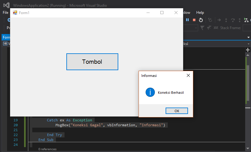 MsgBox(“Koneksi Berhasil”, vbInformation, “Informasi”)