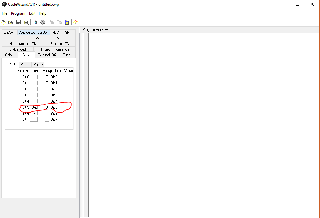 pada bagian Port silahkan atur PORTB pada bit 5 menjadi Out karena akan kita fungsikan sebagai keluaran.