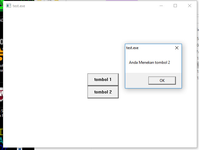 MessageBox (hwnd, “Anda Menekan tombol 2”, “test.exe”, MB_OK);