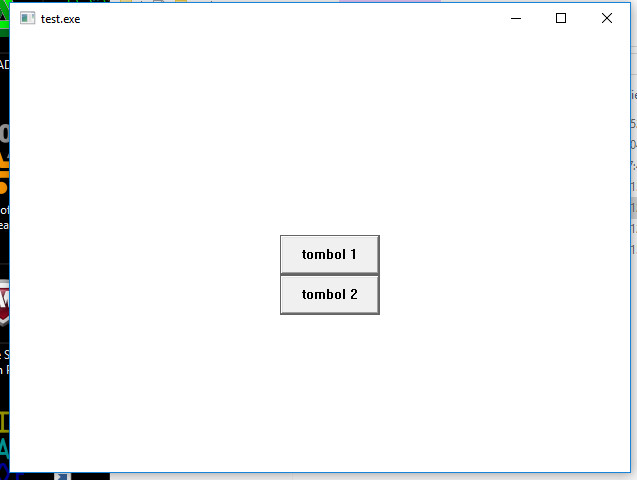 Penjelasan : jadi kita membuat tombol pada WM_CREATE dan ketika kita menekan tombol akan ada message WM_COMMAND, jika kita menekan tombol 1 maka wparam = 1 sedangkan jika kita menekan tombol 2 maka wparam = 2 sesuai dengan tombol id nya
