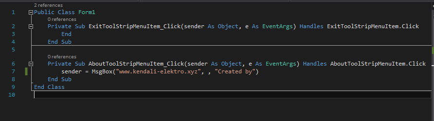 setelah selesei dengan formnya selanjutnya kita klik 2x pada menu exit yang telah kita buat tadi dan buat program seperti gambar dibawah ini